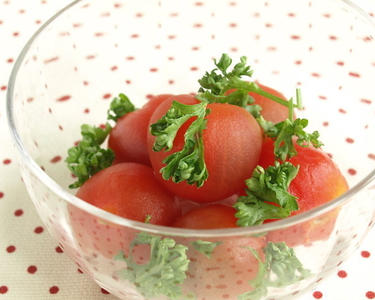 プチトマトとマリネ液を合わせてざっくりと混ぜて器に盛り、パセリのみじん切りをちらして出来上がりです。