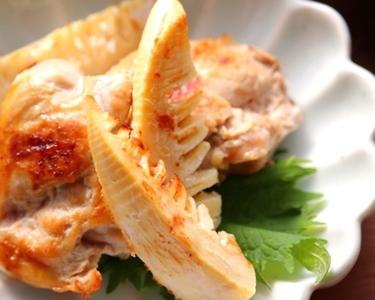 皮を取り除いて脂質をカットした鶏もも肉と食物繊維が豊富なたけのこを塩ヨーグルトに漬けて焼いた旨味たっぷりの一品です。