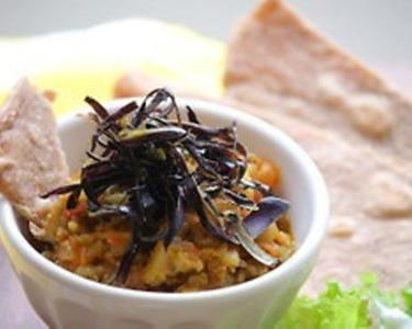 カレーをお皿に盛り、最後に⑤のナスの皮を添えたら出来上がり。