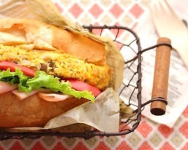 フランスパンを半分に切って、マーガリンを塗り、ハム、レタス、トマト、オムレツを挟んだら出来上がりです。