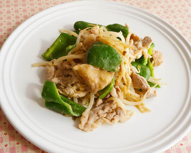 油を熱したフライパンで豚肉を炒める。色が変わったら乱切りにしたピーマンともやしを入れ炒める。