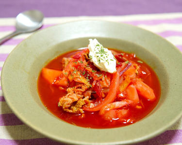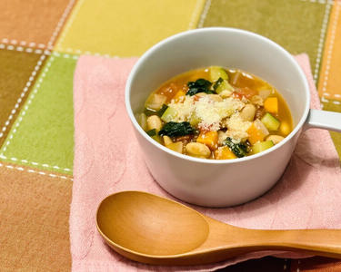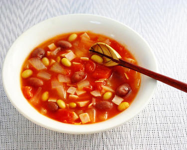 お豆たっぷりの具だくさんスープです。大豆はタンパク質やイソフラボン、金時豆はビタミンB1や鉄、カルシウムを含んでおり、女性に特におすすめです☆