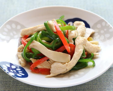 鶏むね肉は1㎝幅の棒状に切りショウガ汁をもみ込む。ピーマンは千切りにする。エリンギは細く裂く。