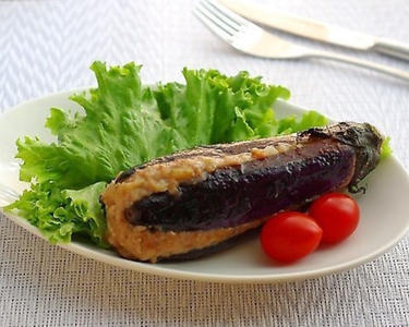 なすは縦に十字の切り込みをいれ、内側を少しくり抜いておく。