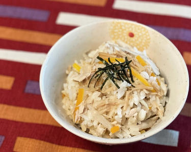 ①に☆、鮭水煮缶を汁ごと、②を入れ30分置いてから炊く。※かつおだしと鮭缶の汁は合わせて250mlになるように調整する。