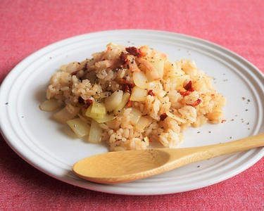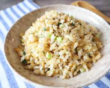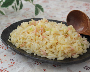 たまねぎが半分ほど透明になったら、ご飯と塩・こしょうを入れ、炒め混ぜる。最後に火をとめ、しょうゆを入れ混ぜる。