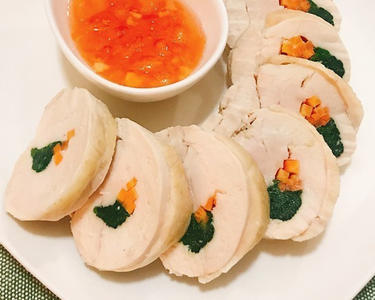 ラップに鶏肉をのせ、ほうれん草とにんじんを真ん中に置いてくるくると巻く。