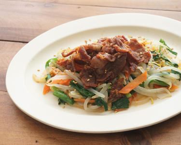 熱湯でもやしと人参を1分ほど茹で、にらも加えさらに30秒ほど茹でる。冷水にとりザルにあげる。ペーパーでおさえしっかり水気をとる。