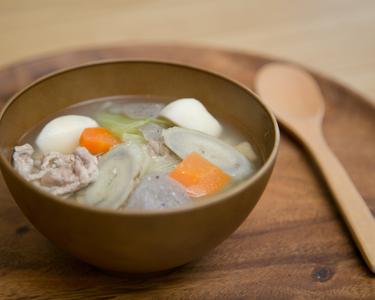 まずは具材を切る。 豚肉は一口大に切る。 ごぼうは泥をよく落とし、斜めに切る。色が変わるので、酢水(分量外)につけておくとよい。 さといもは皮をむき半分に切る。(冷凍でも可) キャベツは食べやすい大きさに切る。 にんじんは皮をむいていちょう切り。 長ネギは斜めに切る。 こんにゃくはゆでて食べやすい大きさに切る。