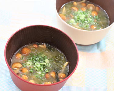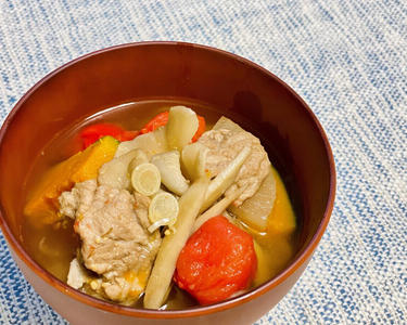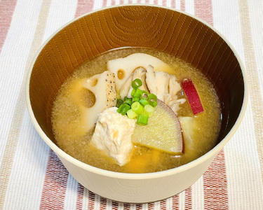 2にだしを入れ、材料に火が通ったらいったん火を止め、みそを入れて、出来上がり。