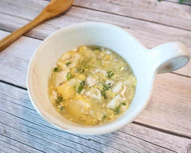 片栗粉を同量の水で溶かし、鍋に入れてとろみをつける。溶き卵をゆっくりと加える。
