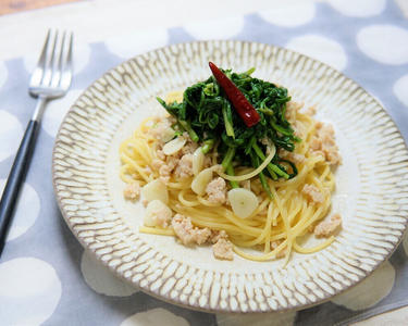 にんにく香る!しゅんぎくと鶏ひき肉のうま塩パスタ